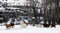 Una manada mixta de caballos salvajes y domesticados en la nieve.