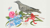 La ilustración del siglo XVIII de un pájaro negro con flores, mariposas y una cinta roja.